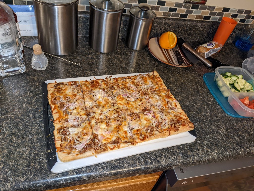 Smoked turkey, Iron-Skillet Pepper biscuits, Riced Potatoes, Green Bean Casserole from scratch (no Campbells soup crap here), Gravy version 1 (basic turkey gravy), Gravy version 2 (giblets gravy), Spanish-American corn, and Blackberry stuffing (dressing)