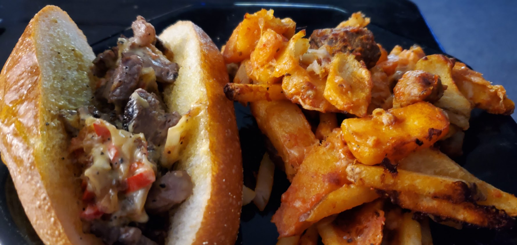 Cheesesteak sandwich with a jalapeno dressing, and cheese fries with meatballs.