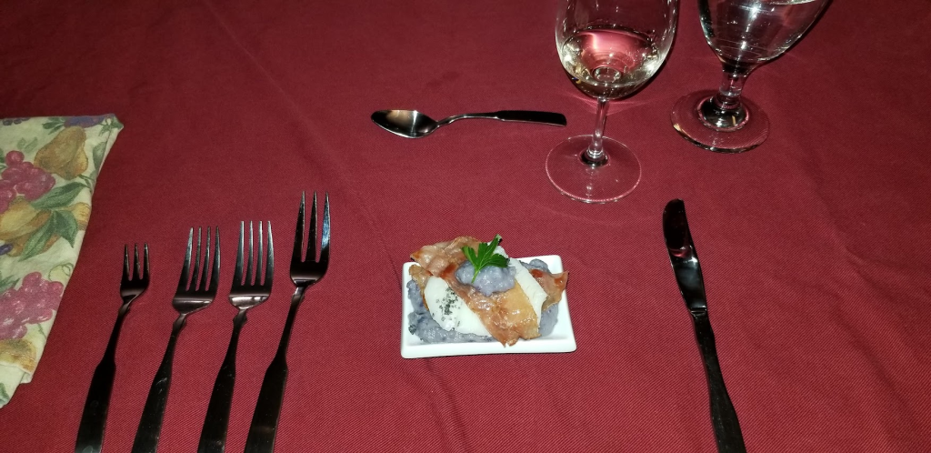 Started with Purple potato mash, Halibut cheeks with Icelandic Lava Salt, and crisp Prosciutto.