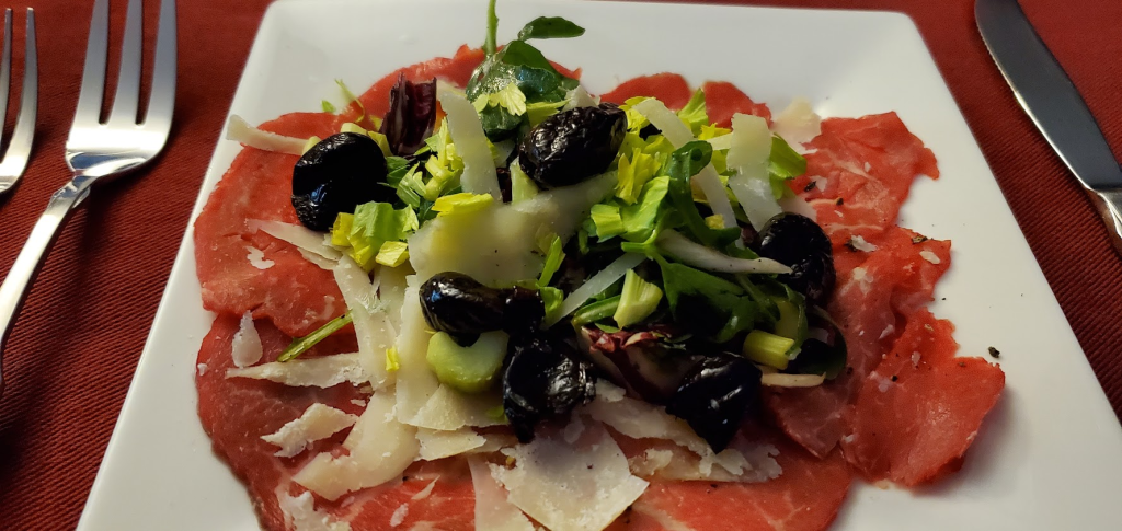 The antipasti; Beef Carpaccio, with Arugula and Celery Heart and a Lemon Vinaigrette dressing. Topped with Cured Kalamata Olives and Parmesan Reggiano.