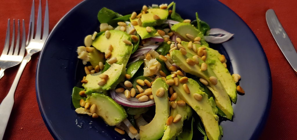 The salad; Baby Spinach and Avocado with Smoked Pine Nuts. Dressed with a Tarragon Vinaigrette.