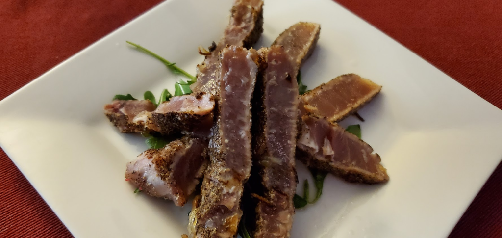 The main course; Pepper Crusted Seared Ahi Tuna on a bed of Arugula and Aged Balsamic.