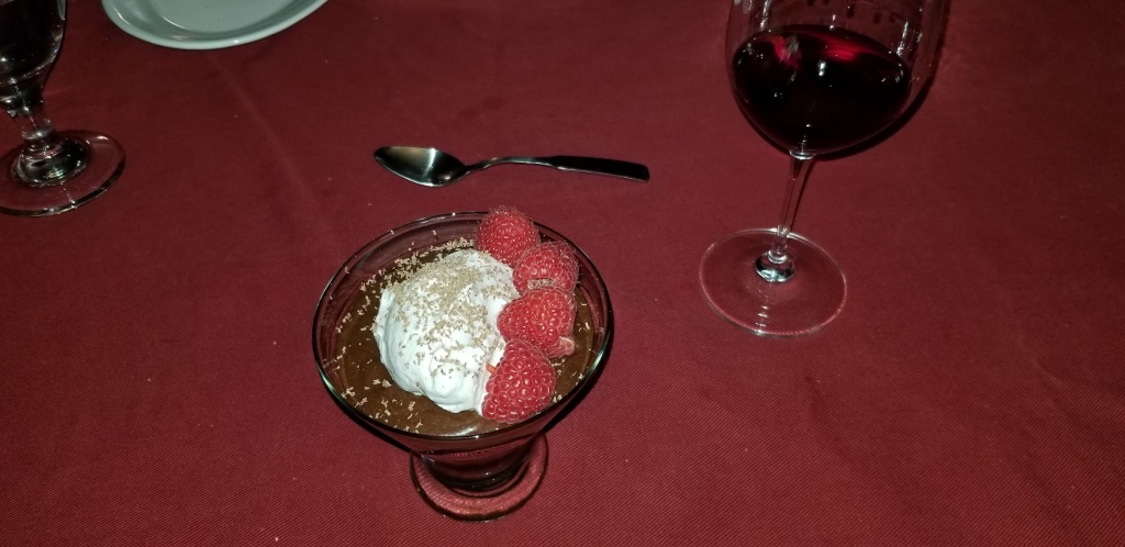 To finish it off, Chocolate Mousse with a Port Wine Whipped Cream and Raspberries.
