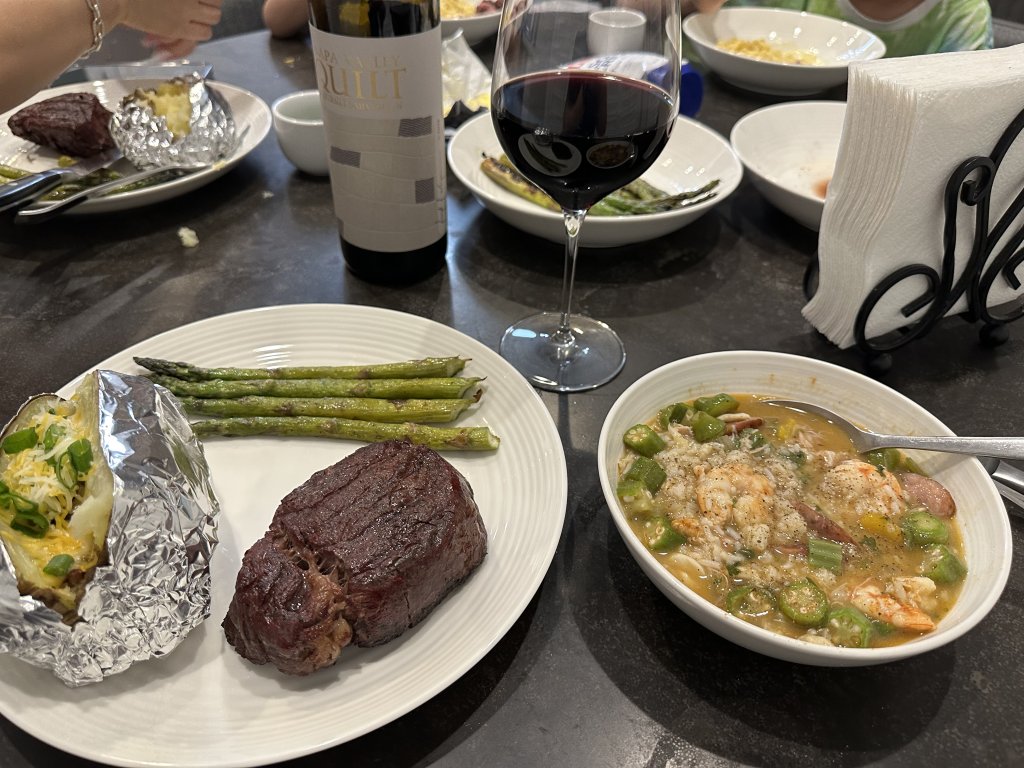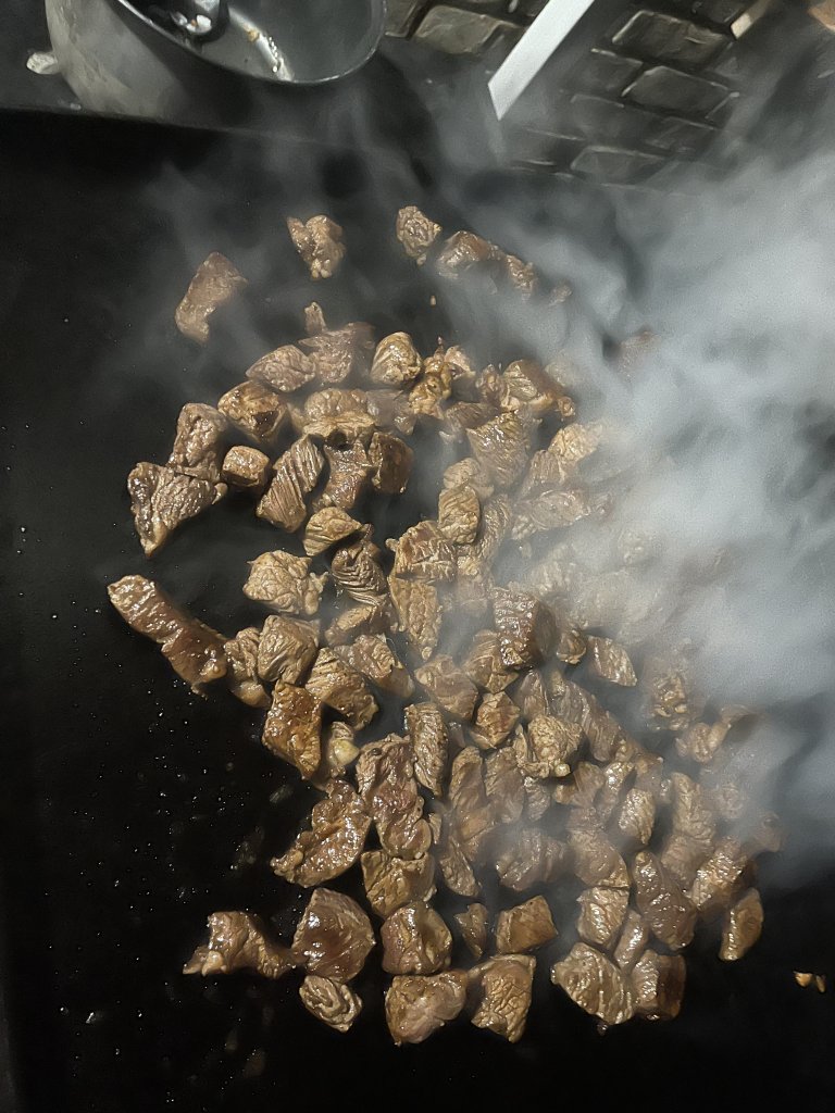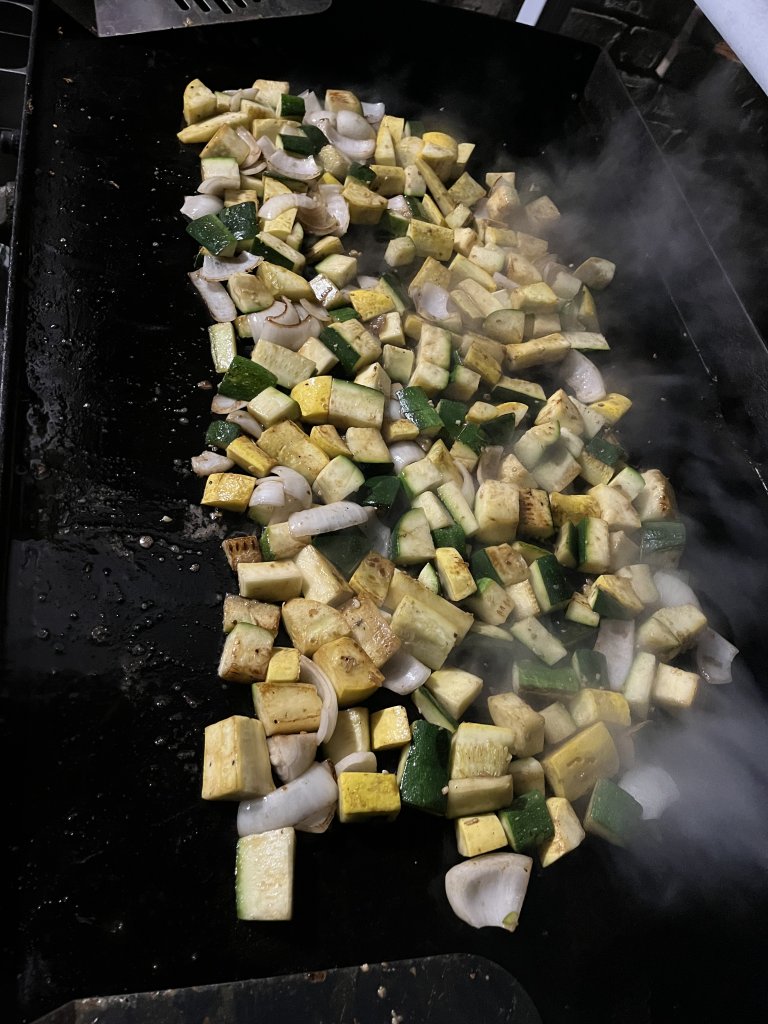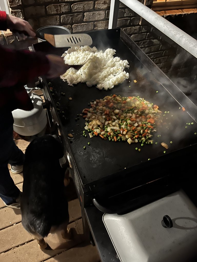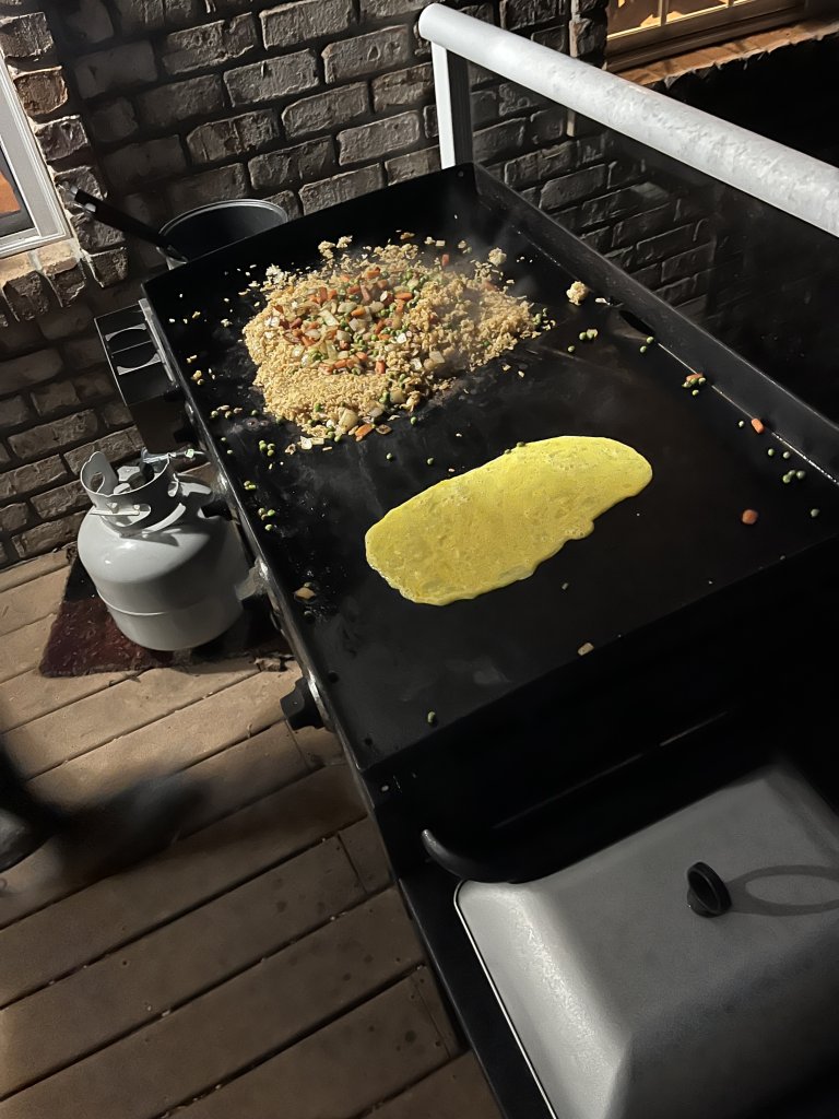 Blackstone hibachi in the 40 degree temps. Homemade fried rice, mixed veggies, and beef.