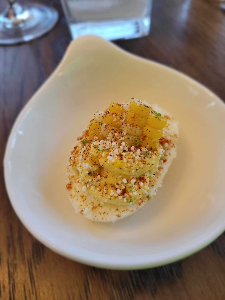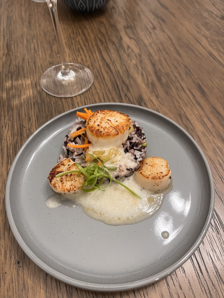Seared Scallops over Black & White Rice, Curry Aquafaba Foam