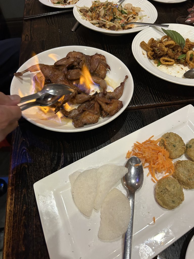 I find that interesting. Flambe typically leaves a residue. Since quail is a high-effort finger food, it seems messy for nice-restaurant level clothing.