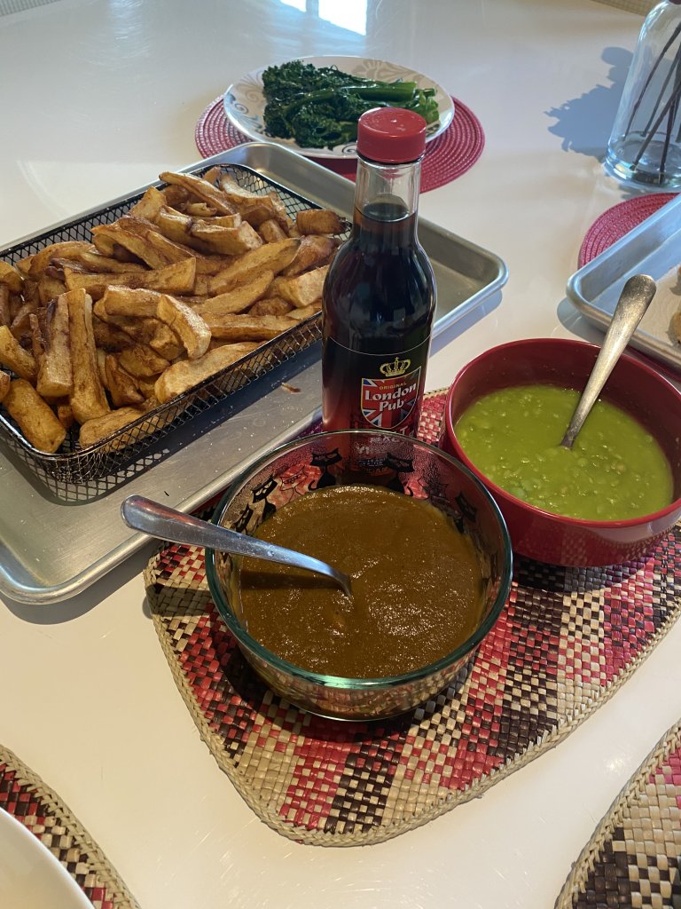 British style fish and chips with mushy peas and onion rings. Whole house smells of oil now!