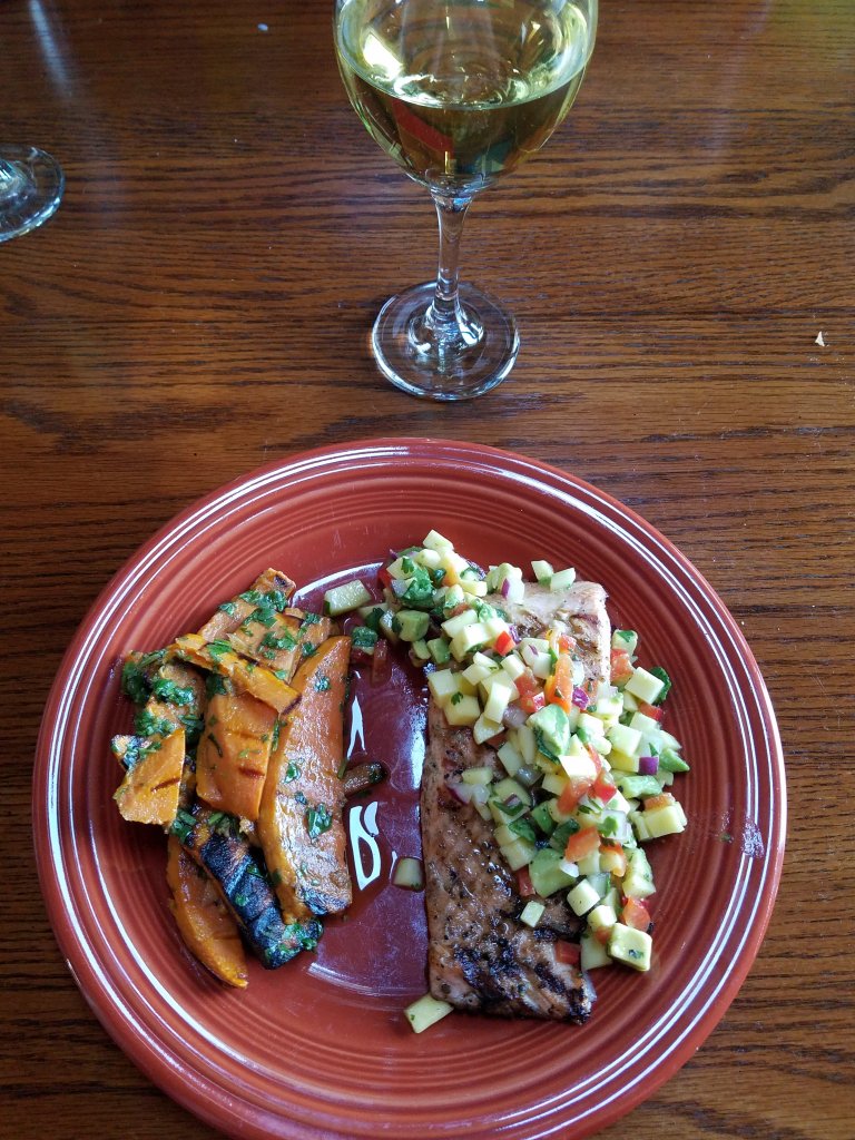 Grilled Lime Salmon with Mango-Avacado Salsa and Grilled Sweet Potatoes tossed in Cilantro Lime dressing. It was fantastic, best salmon attempt yet.