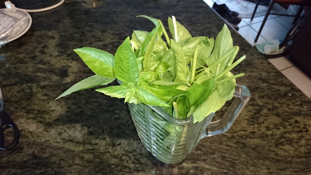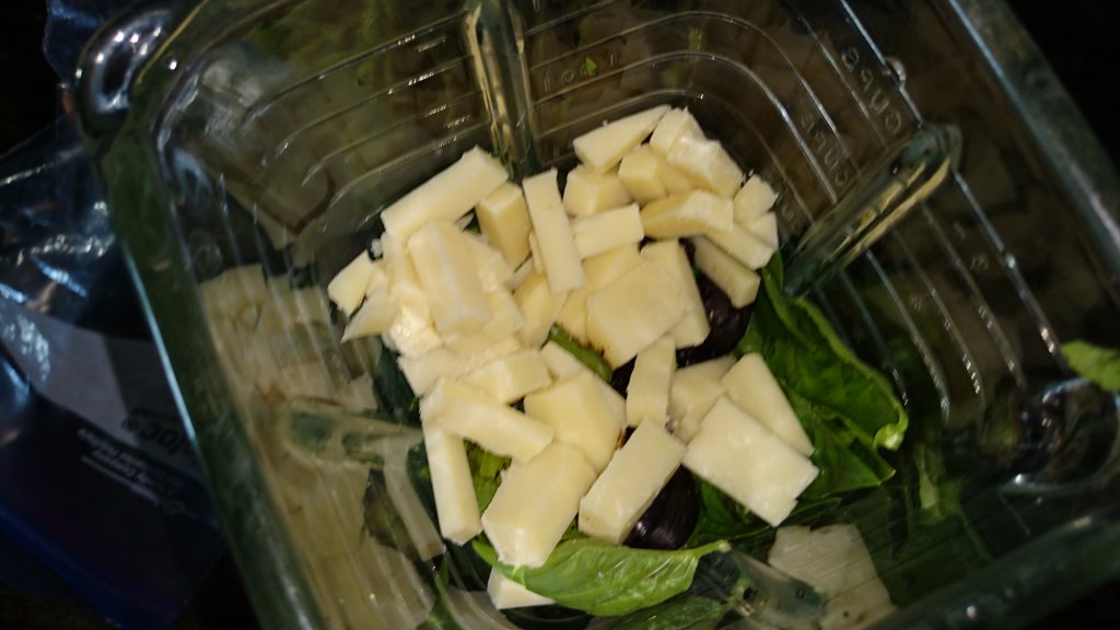 Stems removed from the basil, garlic added and chunks of Parmesan added to the blender.