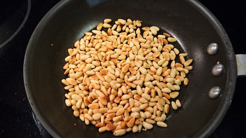 Back in the blender, add extra virgin olive oil on top of the cheese. This helps to cool the hot pine nuts so you don't discolor the basil - though you wont notice dark basil in this dish. Salt for flavor and blend until it's thick. If it's not blending, add more olive oil. If it's too thin, add more everything else. Obviously, it helps to use just a little oil to start and just keep adding as needed.