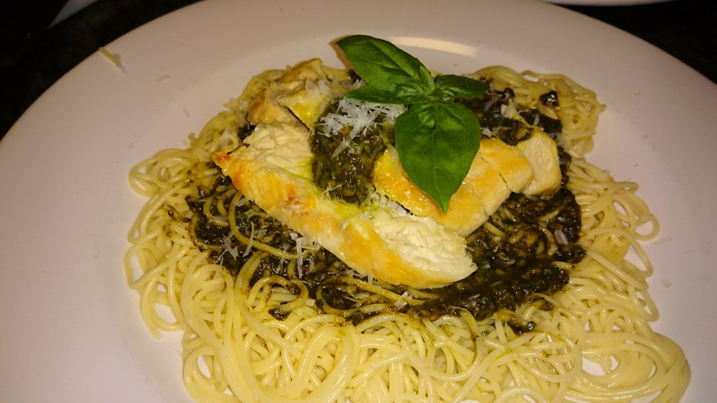 Layer pasta, pesto, grilled chicken, a little more pesto, grated parm, and top it with a little more pesto...