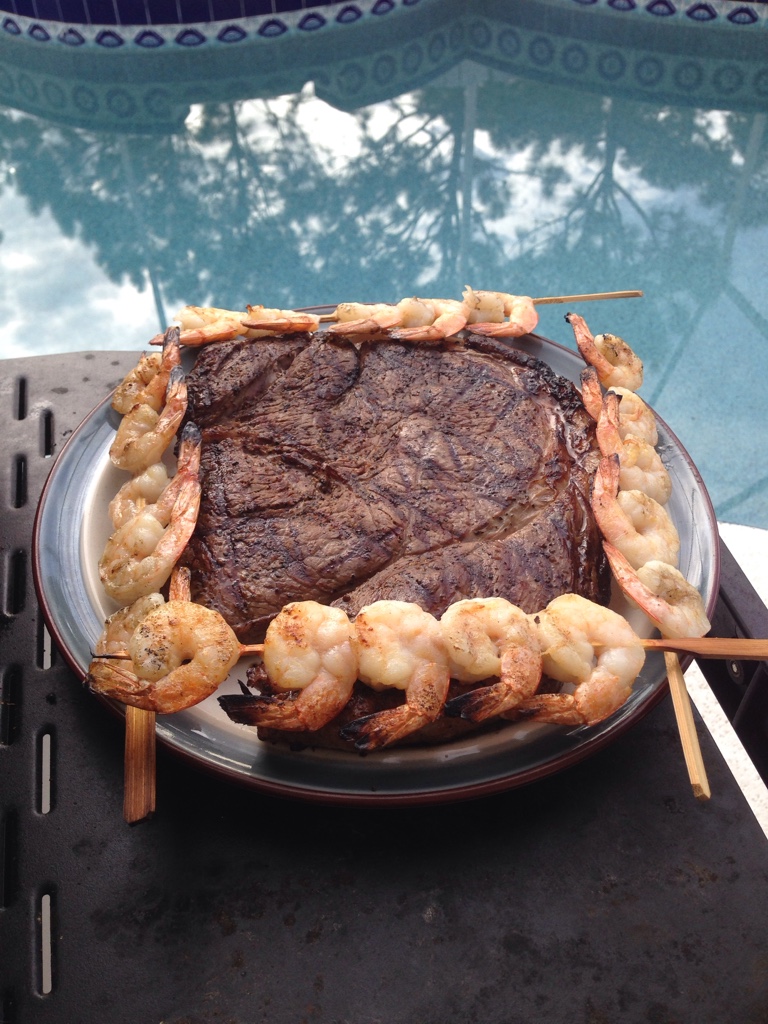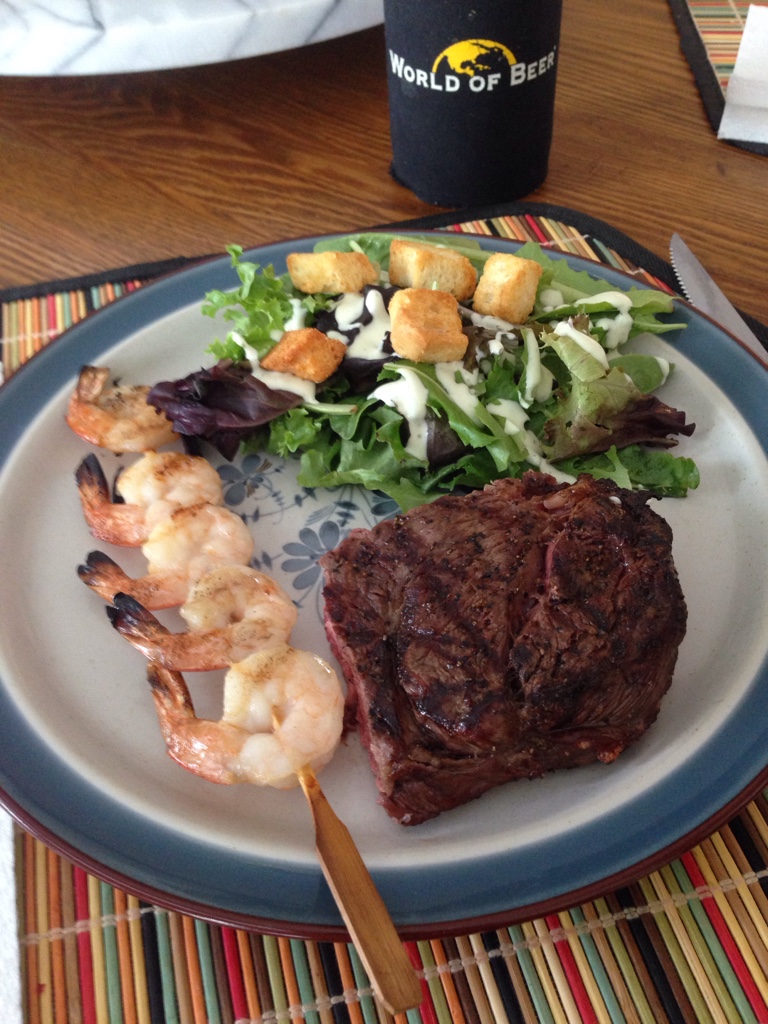Steak, Cajun seasoned shrimp served with grilled potatoes and onions with a kale salad.