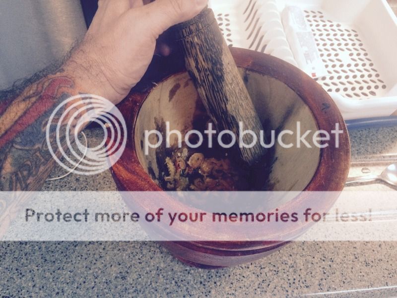 Put the garlic and chili and a wooden or clay mortar and pestle and beat the crap out of it. Don't let the seeds from the peppers fly out and hit you in the eye. If this happens you are forked for the next several minutes. Then add the shrimp and greens and bruise them in.