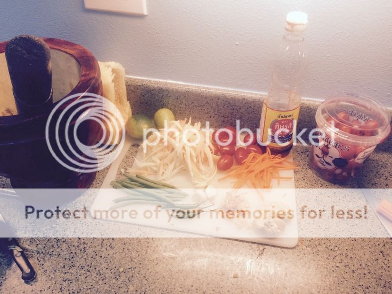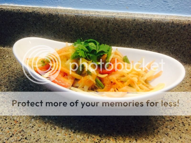 No dinner plans, can't wait that long. Sooooo for lunch we'll go light - Thai Papaya Salad (improvising with a few ingredients) @Puggy this could produce the same result as the enchiladas I PMed you about.