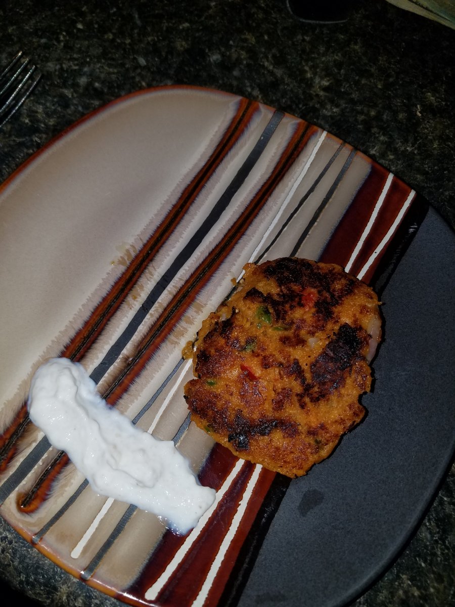 Plating tip: I would suggest the schmear of sour dream across the black of the plate, parallel to the white lines. Use the tablespoon to glop it on in one pile, then with one swift stroke with the back/tip of the spoon. Place the first patty on top of the largest part of the glob and then fan the rest from there so it looks like a deck of cards fanned out. The vegetables or other side goes in the arc of the fan.