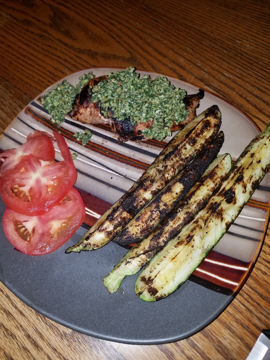 lime marinated chicken with a home made basil and roasted almond pesto and zukes