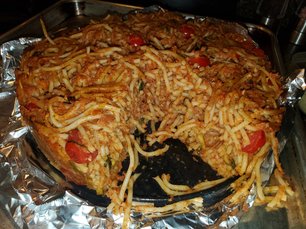 From the "Thugs " recipe cook book. Crispy spaghetti pie.