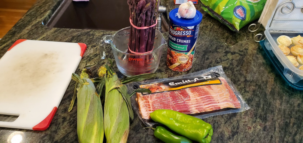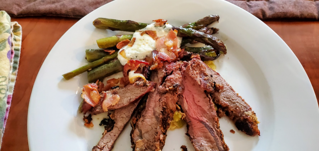 My final plate, Breaded flank steak, cooked on the grill with a corn salsa. Purple asparagus (oven roasted cooked under a layer of the bacon) with a mozzarella sauce, then some of the bacon crumbled on top of the cheese.