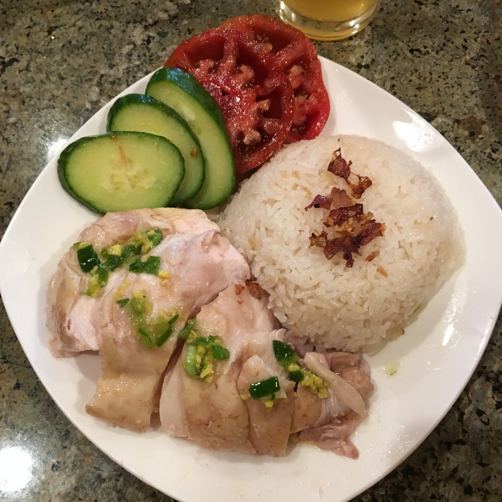 White chicken, but with the actual chicken rice like Singapore.Is that white Chicken or like drunken chicken? I love the toppings that go over the chicken when my wife makes it. I could eat just the topping without the chicken but with white rice..