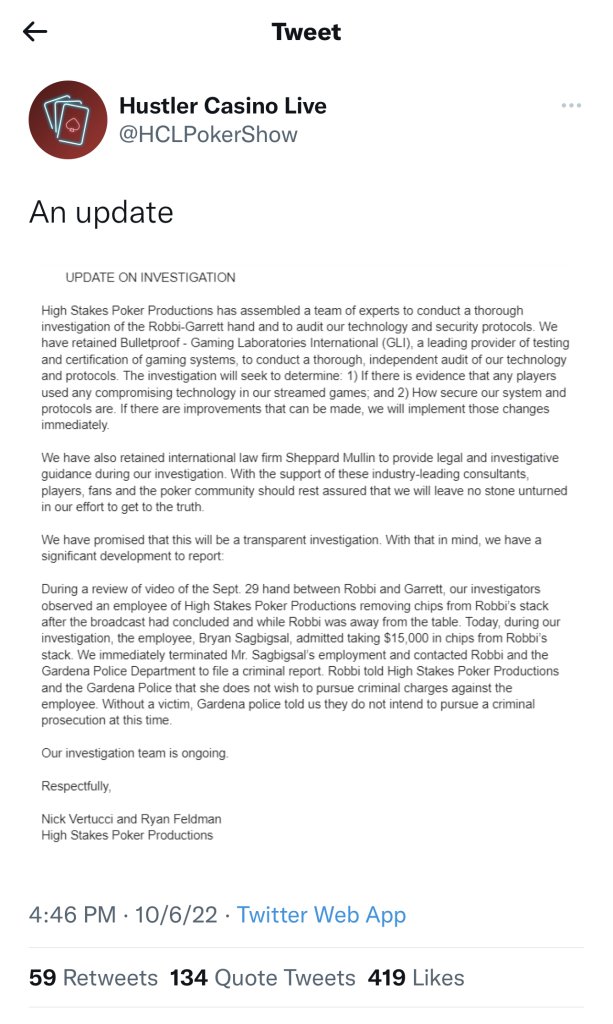 It wasn’t the dealer. He was a member of the production team who apparently had access to the hole card footage (not confirmed yet).Sounds like the dealer thought she really didn't care about money so he helped himself. More fuel to the fire but doesn't prove anything one way or the other... yet.