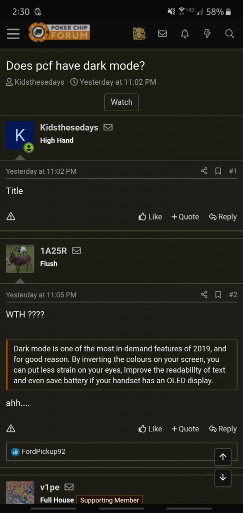 Negative. The forum software certainly supports themes, but they aren't user-switchable - Tommy would have to either install a dark mode theme and activate it or otherwise update the currently-employed theme to use dark mode principles. It would then be the default for everyone, though. There's no place where users can turn such a thing on or off, and it doesn't look like there's any add-ons that support such functionality.