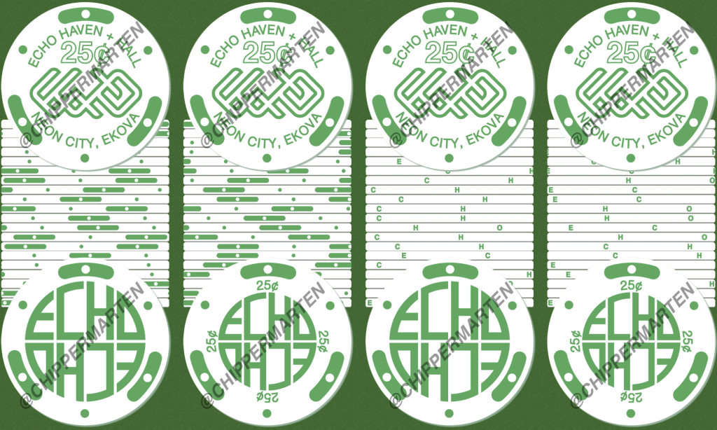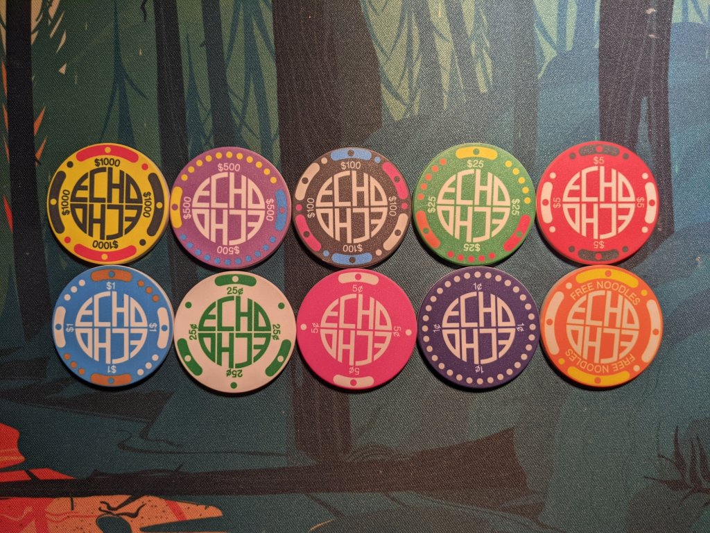 I knew that I wanted to try and maintain the original logo since it was the inspiration behind the set. (Using the $5 chip because I enjoy the red color for prototyping). So I tried a blocky version without the faint ECHO in the background. I also tried a white inlay version since I've been liking that as of late. (And I also tried to do just the original lines of the ECHO logo and it felt way too sparse without the added color of the neon sign aesthetic.