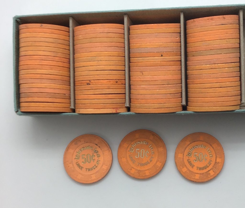 One of you will need to clean these, but again, most will stand on their edge. This is a chip potential lot. This is our remaining quantity of Lakeside Inn 50 cent chips. The price for the 80 chips is $160 ($2 a chip) with free shipping. The first who sends me a private message get them.