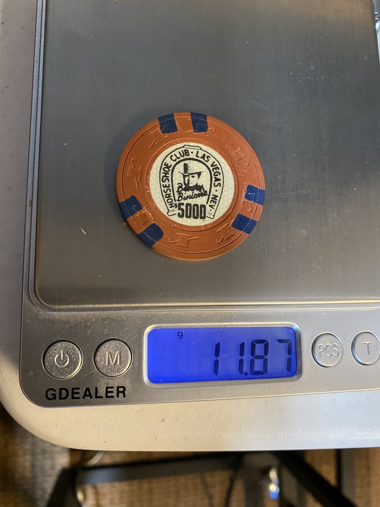 To be fair, your chip was used on the casino floor at some point. There is no record of my chip in any price guide, and only a couple have sold in public that I've seen, so it was never in play. My best guess is that my chip was made at the same time all the horseshoe mold $5k chips were also being made (different manufacturer), and none of those were in play either, although they are MUCH more common and sell regularly for $20-40.The $1 I have always feels pretty hefty too but not like that!