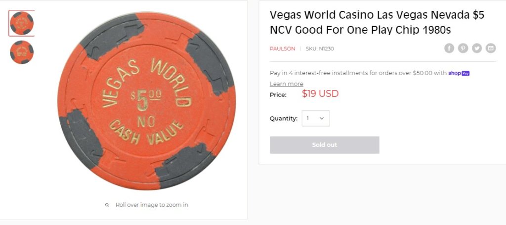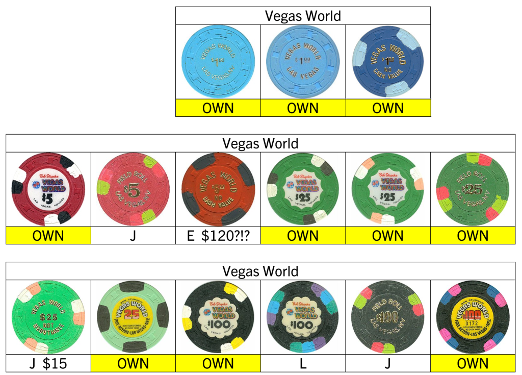 Really should only pay around this price or lower for that $5 NCV. $120 is crazy.One of my favorite things to do while curating my Rat Rod is to collect a "full set" from a casino. I got three more from this set today, and the rest *are* obtainable (no idea why a Vegas World $5 NCV sold for $120 once, but it did). I'm in no rush, though, and certainly not enough to pay too much for any of these chips. Stupak's casinos had some great chips, and Vegas World was probably the best.