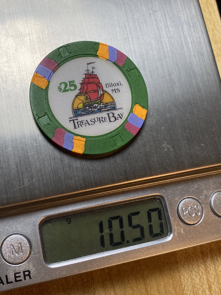 The $1 I have always feels pretty hefty too but not like that!I got this new single this week. And it has nothing to do with my Rat Rod set. Anyway, I had the single out, in my hands, because un-slabbed poker chips allow this, and handling them has zero chance of affecting the value, unlike a lot of other collectibles (looking at you coins, sports cards, and Magic cards). With all the chip weighing I do, the chip just felt DENSE. On a hunch, I weighed it.