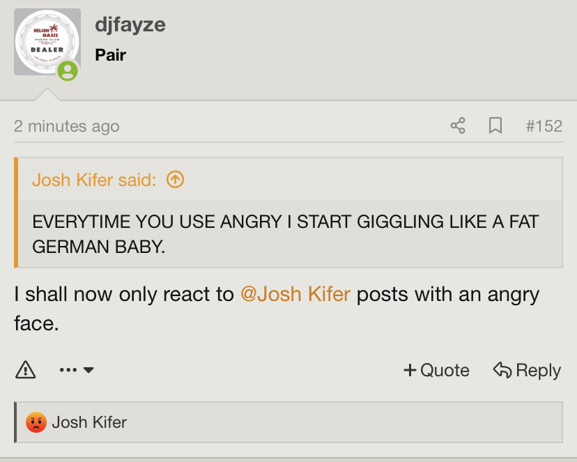 I shall now only react to @Josh Kifer posts with an angry face.EVERYTIME YOU USE ANGRY I START GIGGLING LIKE A FAT GERMAN BABY.