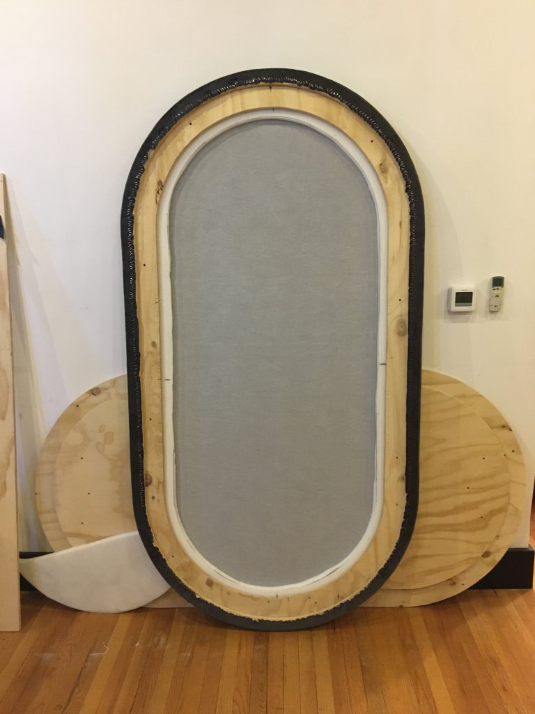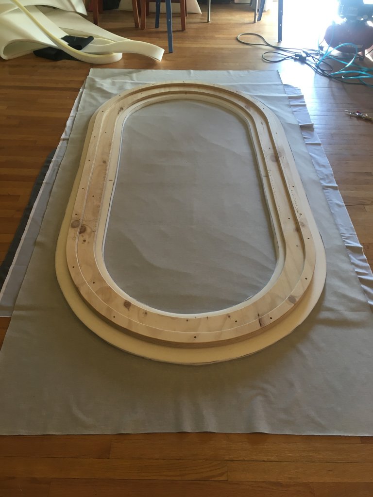 Start with the center of one long side with a couple of staples, then the opposite side with a couple of staples (stretch first), then the center of one curved end, then the center of the other end. Then pick a center spot between two of your stapled points and stretch staple a couple there, repeating the process where you always pick a new staple spot that is half the distance between the longest stretches of non-stapled material.