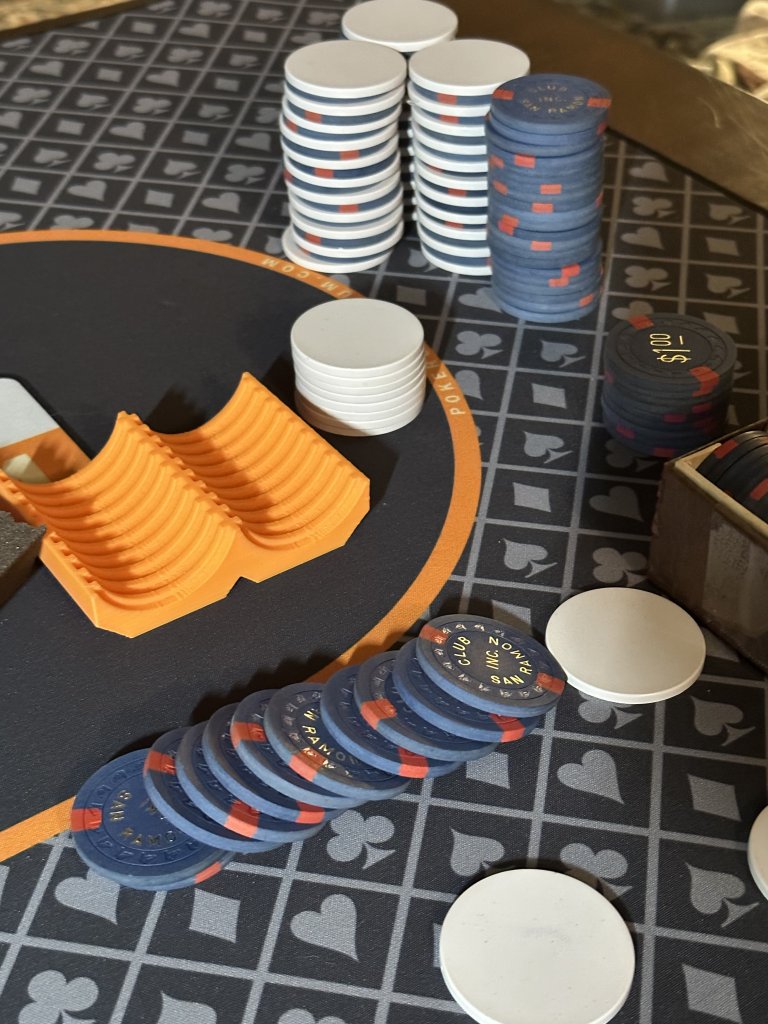 Not sure if there's any already floating around but I threw together a model for holding two stacks of 10 39mm chips for flattening with 43mm spacers.