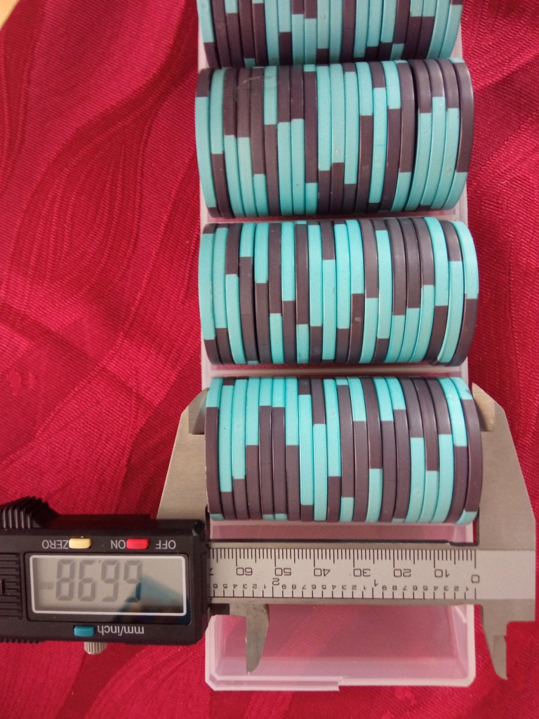 Aaand, I would not reccommend printing this. Fits my bike tire chips just fine, but the 43mm are way too snug and need a bit more room. Chips measured at 3.3mm thick, I set the gap to 3.5mm but clearly my printer aint that precise.