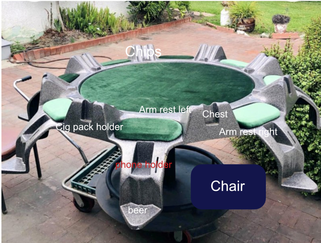 Me: Hi Miguel, this is a very intriguing custom table. I have some questions. Which parts are the beer holders, chip holders, cigarette holders (I smoke cigars, will it hold cigars?). Trying to visualize how it works. Is it portable? Thanks!