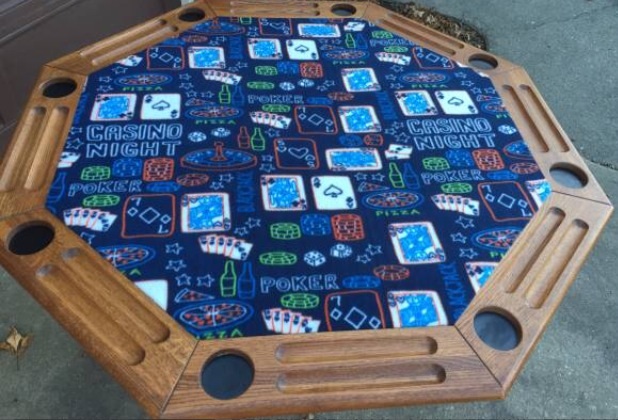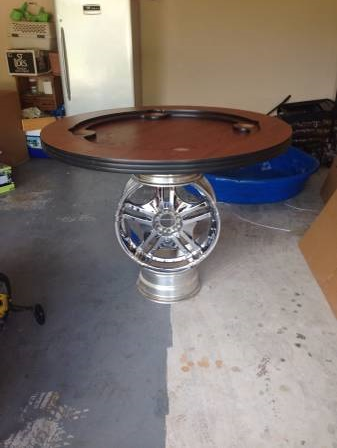 Excellent custom made Poker table for a car guy. The base is made from wheels and the top was CNC Machine cut. Cork inserts for the cup holders. My apologies for the pics, I thought that I'd taken better photos earlier. If you need more please let me know. Let me know if any questions. Call text or email is fine. Thanks.