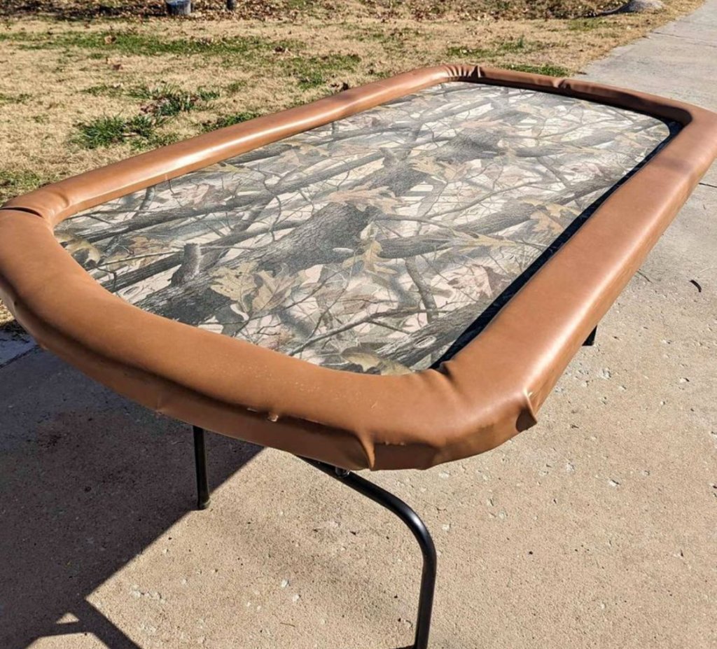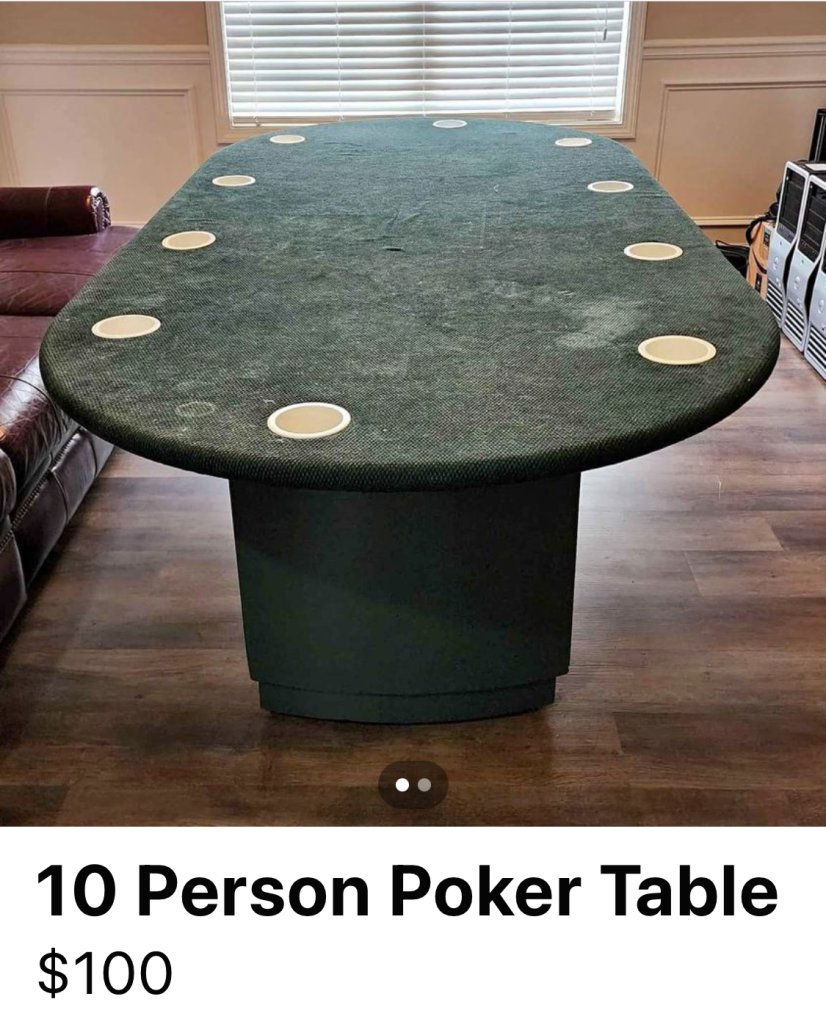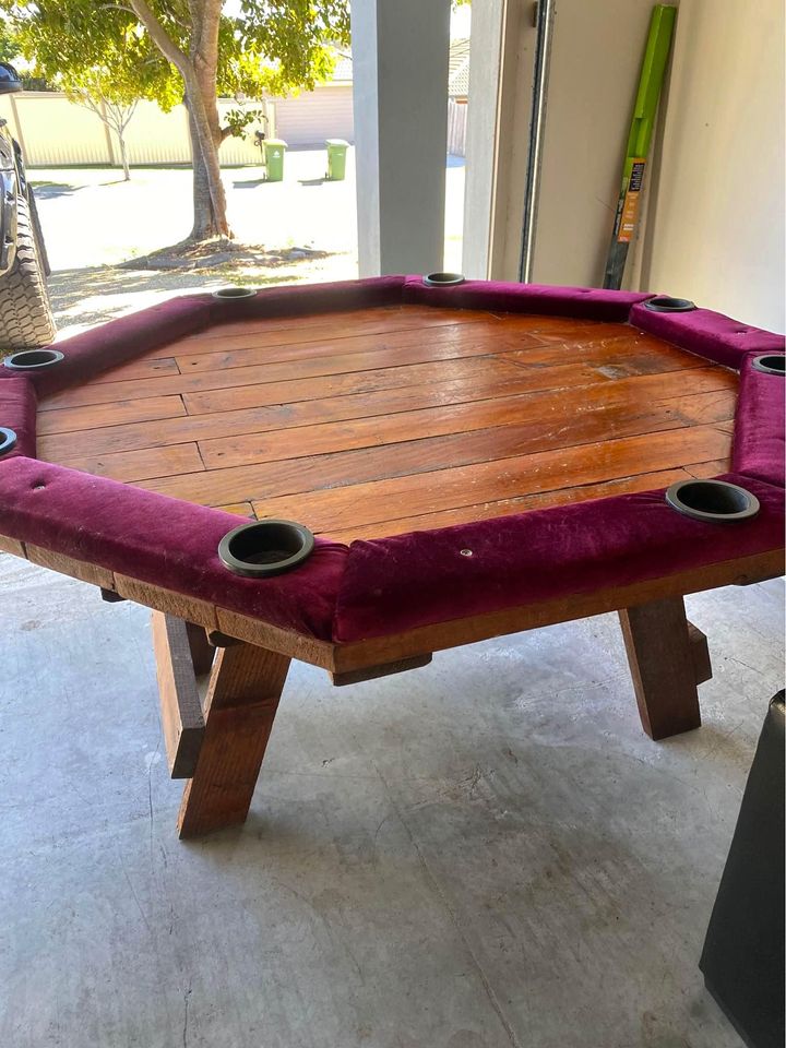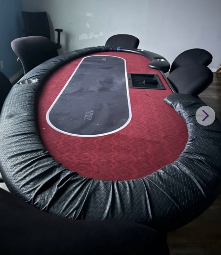 This one is a mixed bag for me. The chip trays would get on my last nerve, and the color of the felt is way too loud for me. However, the art on the railing is interesting.