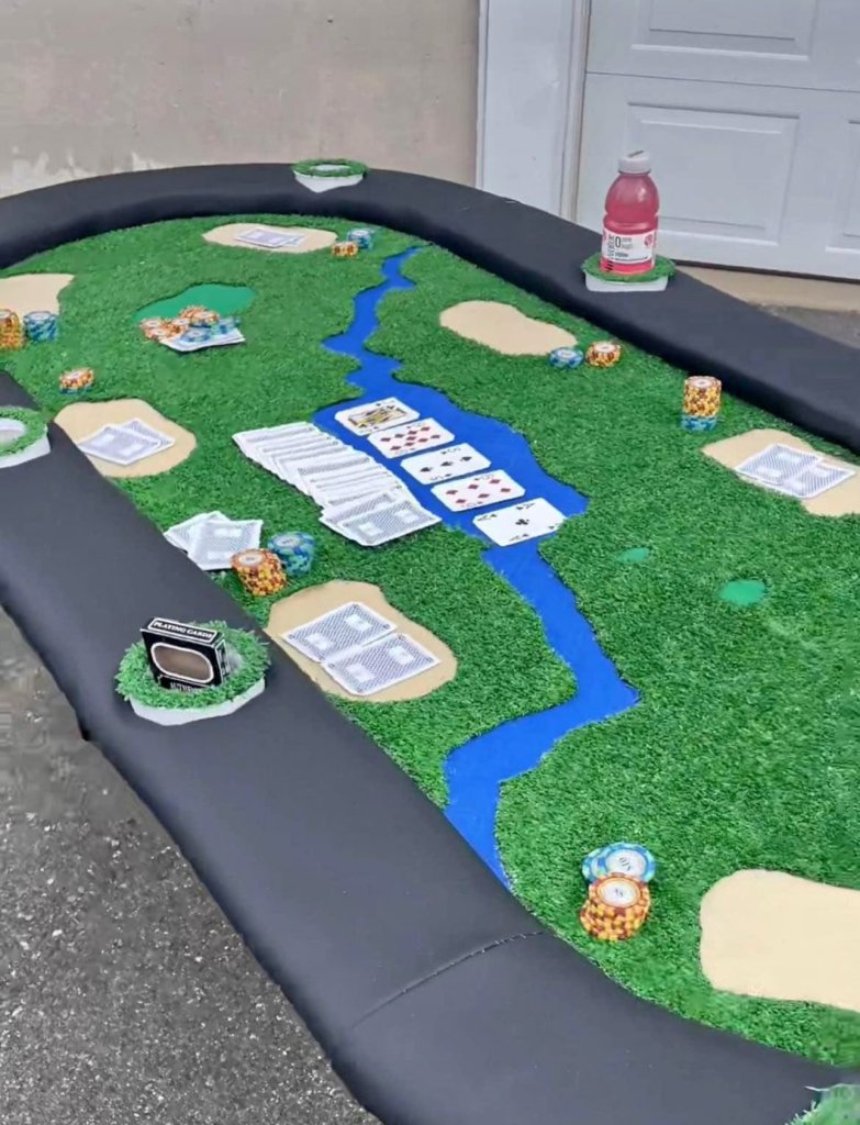 That is a pretty imaginative and unique application, even though they sorta screwed up on the turn and river position options. Ah, what coulda been.... and a 'printed' felt (vs artificial turf ffs) could capture the essence without destroying the playability. A printed "greens" racetrack with those hole cupholders (flags optional for seating assignments) would have been awesome imo.