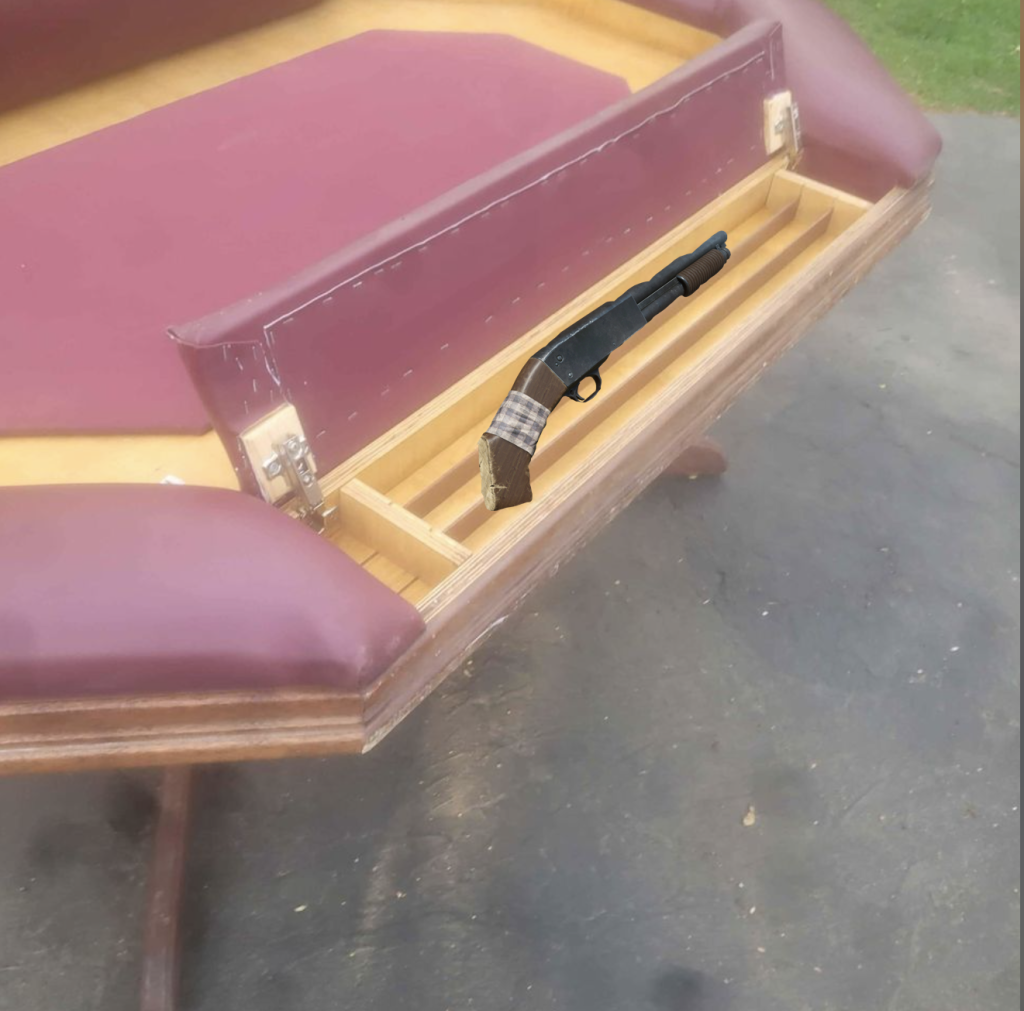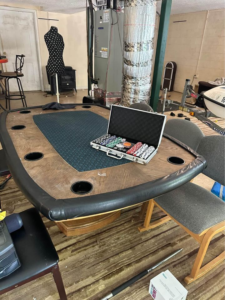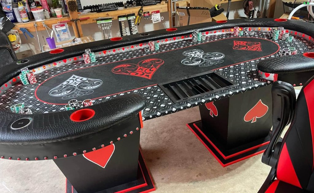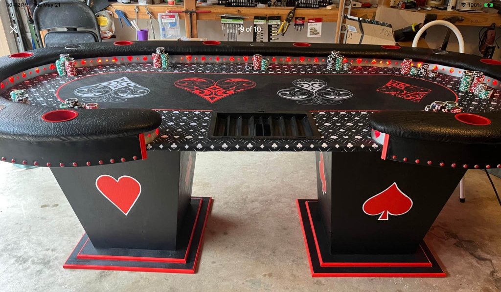 I honestly think if it was done right on a real nice table it could be very cool to open it and see horizontally racked chips ready to go.I agree! That is why I couldn't caption the photos. If this didn't have the wood race track and an upgraded felt it would be an alright table. I wonder if a flip up rail could be done on an oval style table.