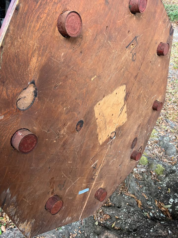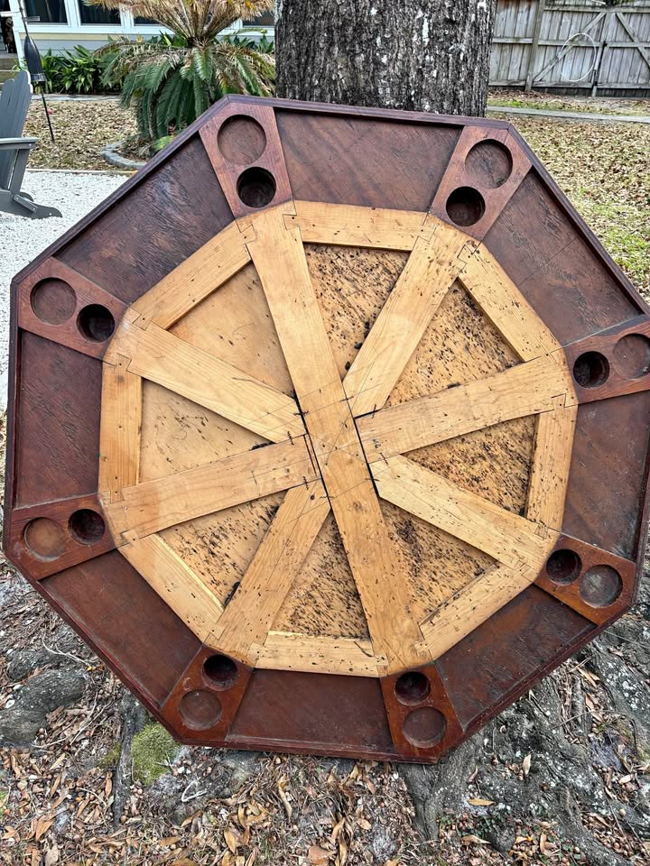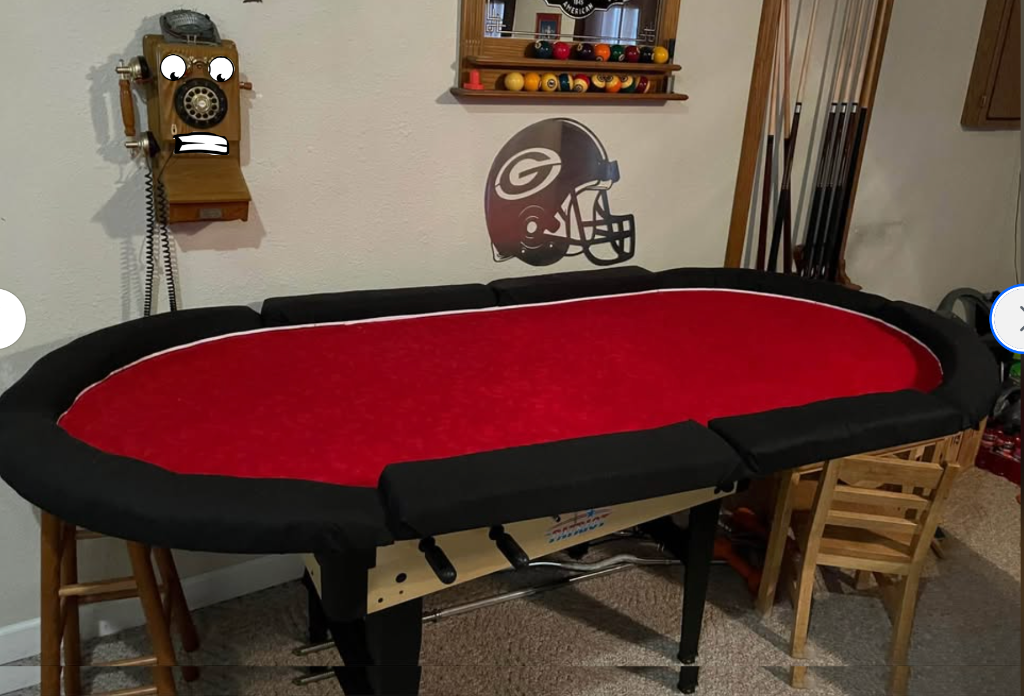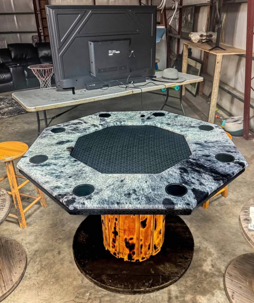 Looking for a showstopper for your game nights? This custom-made poker table top is crafted from solid wood with expert dovetail joinery. Features 8 player spots, a dedicated chip holder, and convenient drink/beer cup holders. Measures 53" in diameter.