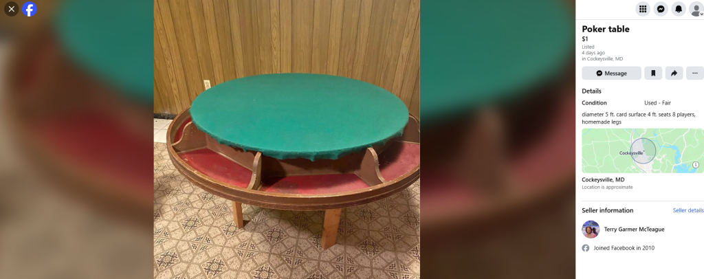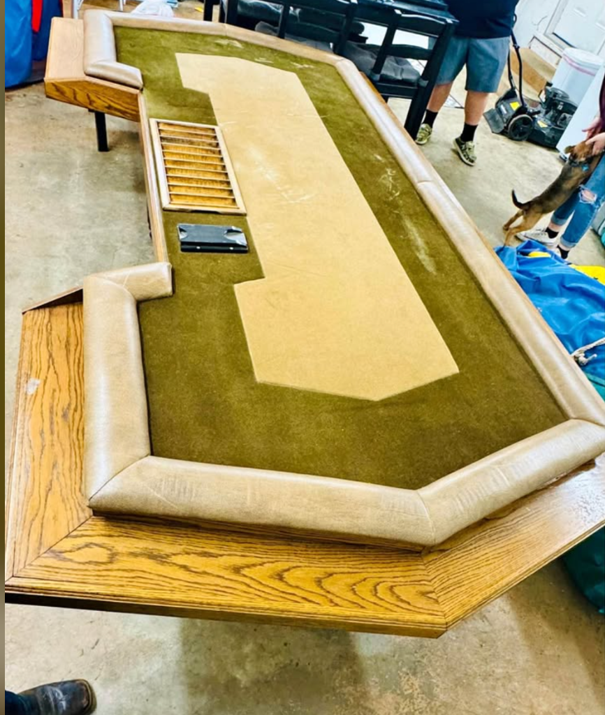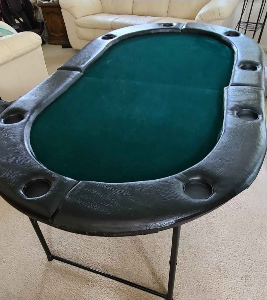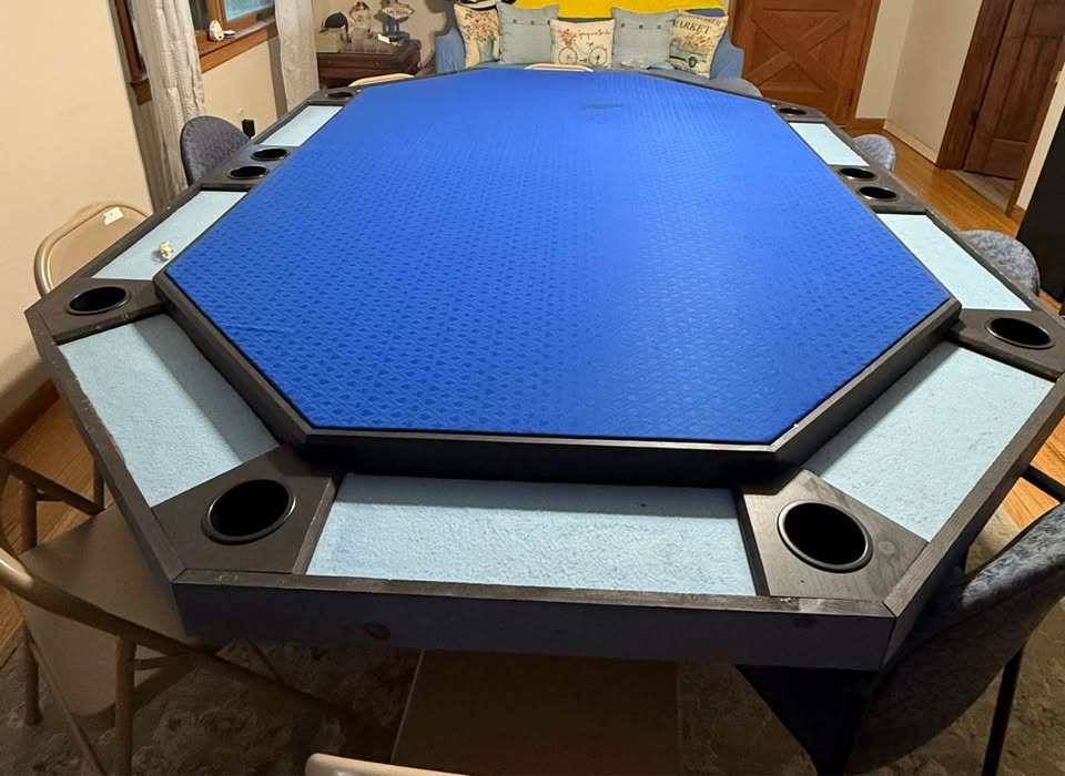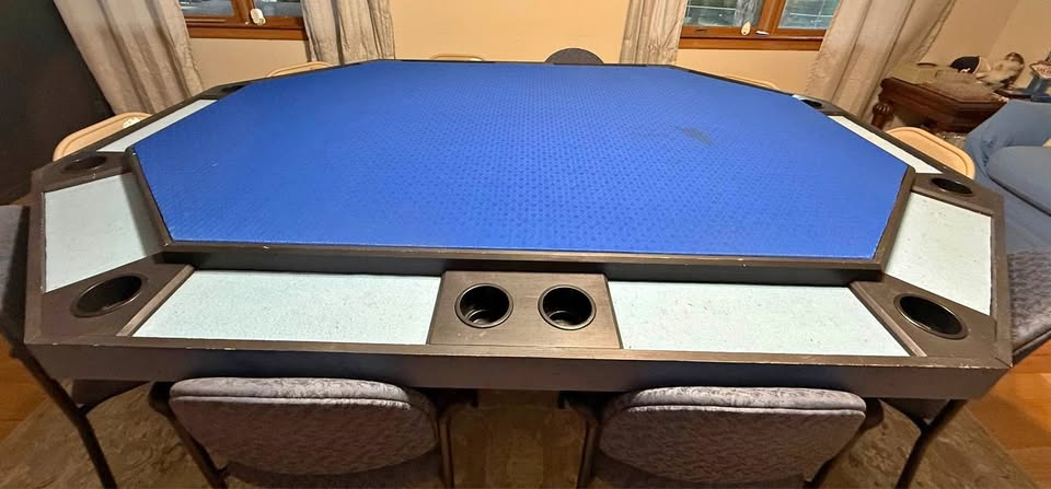 This poker table was professionally built for 10 players. It has a padded playing surface with professional grade speed felt. Lowered chip trays and individual cup folders.