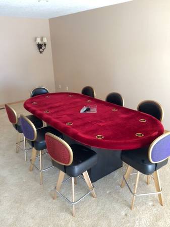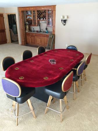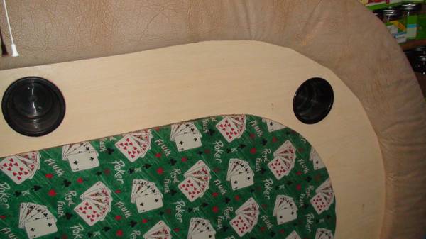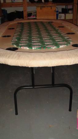 Up for sale I have a home made heavy duty poker table. The playing surface is done in quality poker table fabric for easy card slide. It has a stained wood surround with inserted drink holders. The surround edge is a padded cushion for comfort. The underside of the cushion is lighted for playing area illumination. The legs are foldable for easy storage. I have over $300 in parts alone, not counint labor to build it. I am moving and have no room for it. Very heavy duty and made to last. Contact thru Craigslist. Thanks for looking.