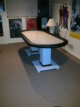 8' x 42" casino style poker table for sale. Padded rail, padded playing surface, seats 8 comfortably. Dual pedestals make this table extremely sturdy. This table is not something you fold up and put in the closet. It demands a space of it's own.