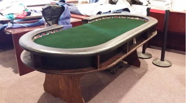 This is a 10 person poker table that is in good shape with padded rails as well as a rail to place drinks on. The legs come off for easy storage great table for the serious poker players. Have 1 tables left