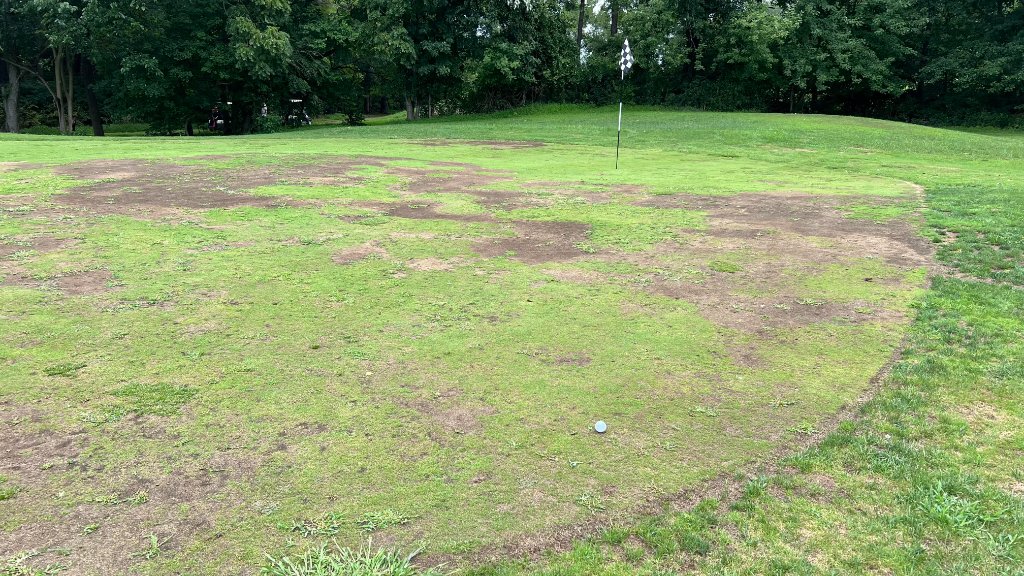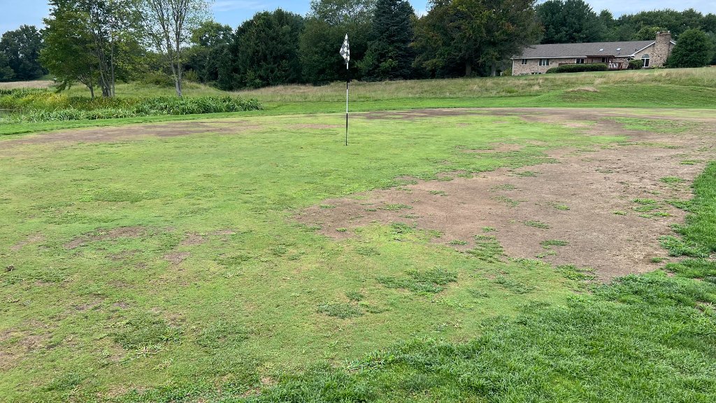 Patches of crab grass all over the green, along with no grass, dead grass, cracked ground, etc... I 3-putted more times than I'd like, because you couldn't get a good roll. You'd have your putt lined up, its rolling well, hits the crab grass and either stops or kicks in another direction. unplayable !!