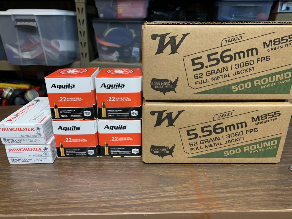 So I claim my spoils of war, place the ammo into the cart, and now I notice they have 9mm (Winchester white box) for $13/box... This also has a two box limit, so I snag two boxes of that... The old guy asks about .22LR and the clerk indicates he has some of that too... I ask how much, and the clerk says a decent supply (I later find out he's grossly underexaggerating his stock).. The 2nd clerk brings out a case of 2000rds of .22 (in 250rd boxes), I ask if there's a limit, and the clerk says not on the .22... I snag 1000rds (4 boxes), and I head to cash out... On the way, I text my posse, who all rush to the store to snag their limits on 9mm and more .22. I didn't push the issue on the .22 since I was feeling mildly guilty about the 5.56... But when my buddies started arriving and snagging .22 by the 1000's... I was informed they had entire pallets of the stuff, so one of my buddies grabbed me 2k more rounds.