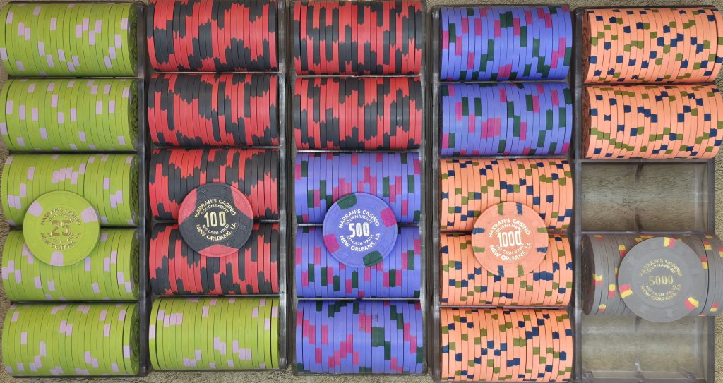My guess is you’d probably have to be willing to mix some Harrah‘s T25s and T100s with your Harrah’s Casino base set since people are more likely to have extra Harrah’s T25s and T100s in their Harrah’s set than people are to have extra Harrah’s Casino T25s and T100s in their Harrah’s Casino set. And by people I mean me lol.