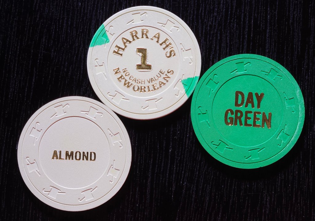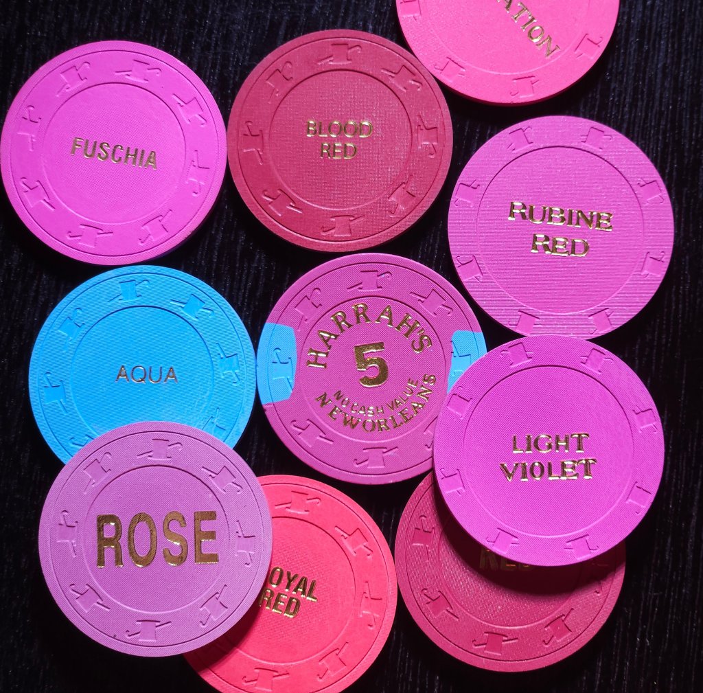 At some point Paulson reformulated the Rose color. I’m not exactly sure when that change was made. I have a rack of the “old” Rose in my Grand Casino Biloxi set. One night I was at a local chipper’s house and we were trying to match the color of the T5 to his Paulson color sample set, and nothing was a good match. That’s when he remembered his old color samples. Pulled out the old Rose, and it was a perfect match. Here’s a pic I took of the two side by side yesterday. Again, the Biloxi T5 is known to be old Rose. I’m pretty sure the Harrah’s T5 base is also the old Rose.