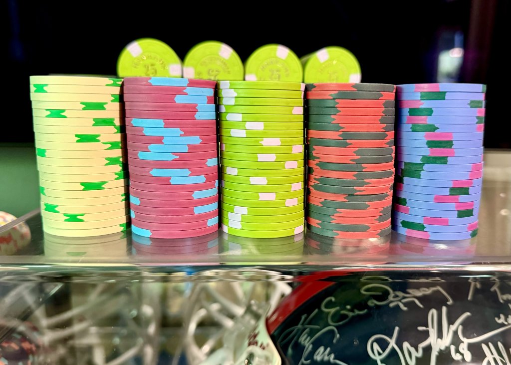 For a normal cash set, $5s are often in the worst condition, but I'm thinking maybe most of the tournaments these were used in must have started with T25, thus the T5s did not get much use. Only thing is, why do the T1s look worse than the T5s?