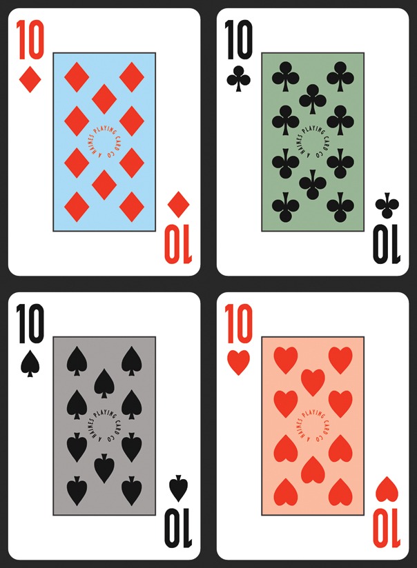 These are a nightmare for me. I appreciate 4-color decks even though I don't buy them. But this hybrid, where the pips are red and black with an added 4-color element - my brain hates it. There's a dissonance or something.